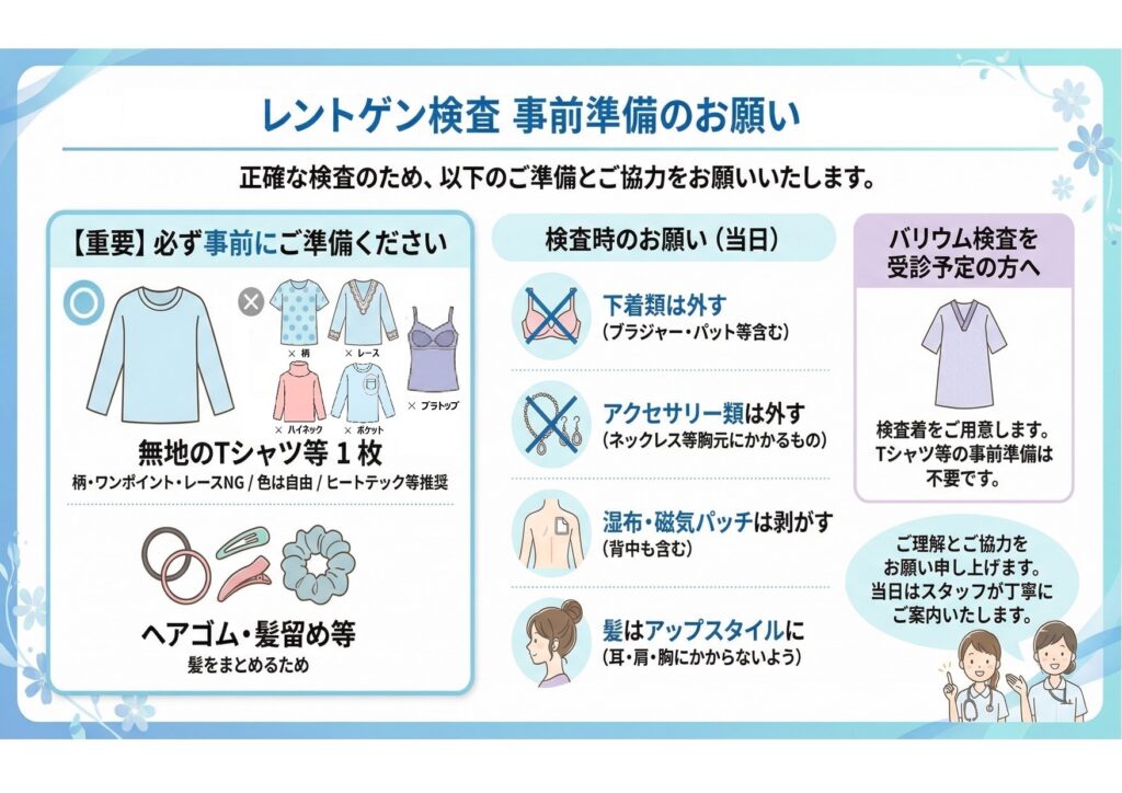 胸部レントゲン検査をご予定の方へのお願い 2026.03.17 お知らせ 巡回健診受診時の服装に関するご注意事項を改めてご案内させていただきます。 健診をスムーズに進めるため、皆様のご理解とご協力をお願い申し上げます。