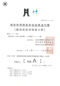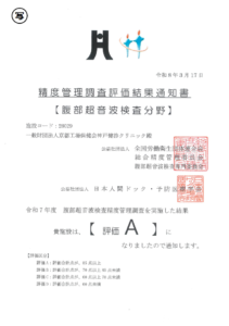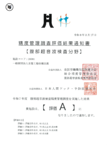 令和7年度の全国労働衛生団体連合会(全衛連)精度管理調査において、腹部超音波検査分野で評価Aを取得いたしました。